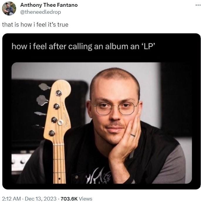 The problem is that there are times when I put significant effort into kick-ass sentences and two-word punches, only to neglect more basic matters. It might be a tiny word that I forgot to delete in the final draft (“to” or “a”), or I employ the same term to refer to something three or four times, rather than deleting the sin (“the car” or “the band”) with a syn…onym. When these ultra-occasional mistakes whiz by — I don’t have the money to hire an editor — my English degree wins. Substack is where our fights are bloodiest; outside of texting and leaving comments on social media, it’s where I write more “on the fly” than anywhere else, as a lightning rod catching high-voltage memories both new and old.